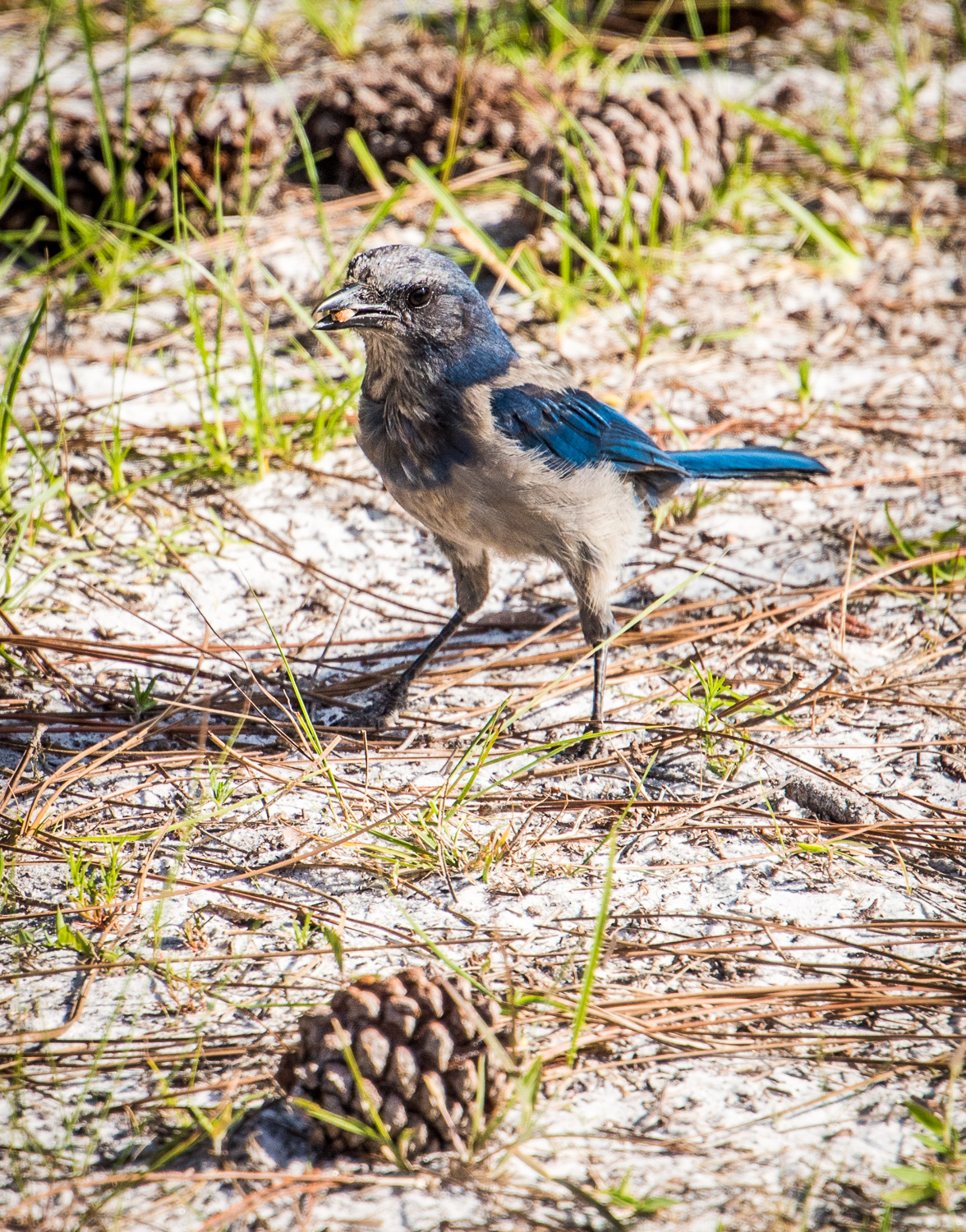 An inquisitive and intelligent species, the most striking attribute of the Florida scrub jay's behavior is its remarkable tameness.[17] As such, scrub jays willingly take food from human hands.