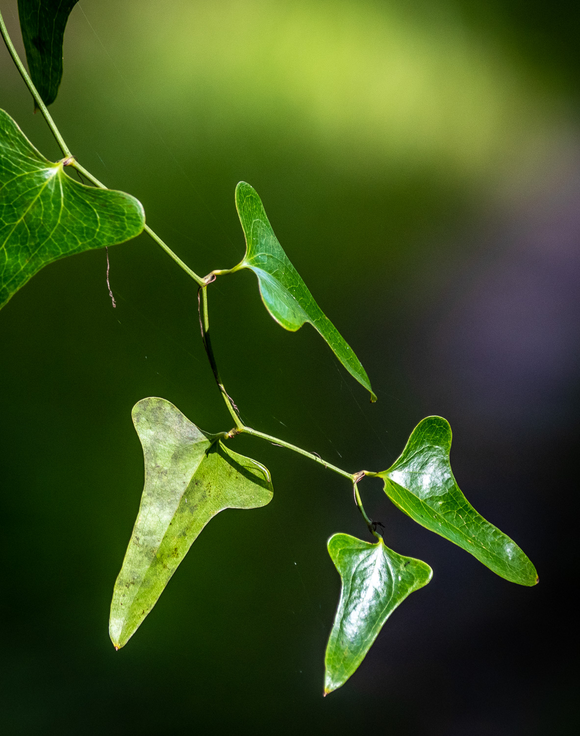 On their own, Smilax plants will grow as shrubs, forming dense impenetrable thickets. They will also grow over trees and other plants up to 10 m high, their hooked thorns allowing them to hang onto and scramble over branches. The genus includes both deciduous and evergreen species. The leaves are heart shaped and vary from 4–30 cm long in different species.