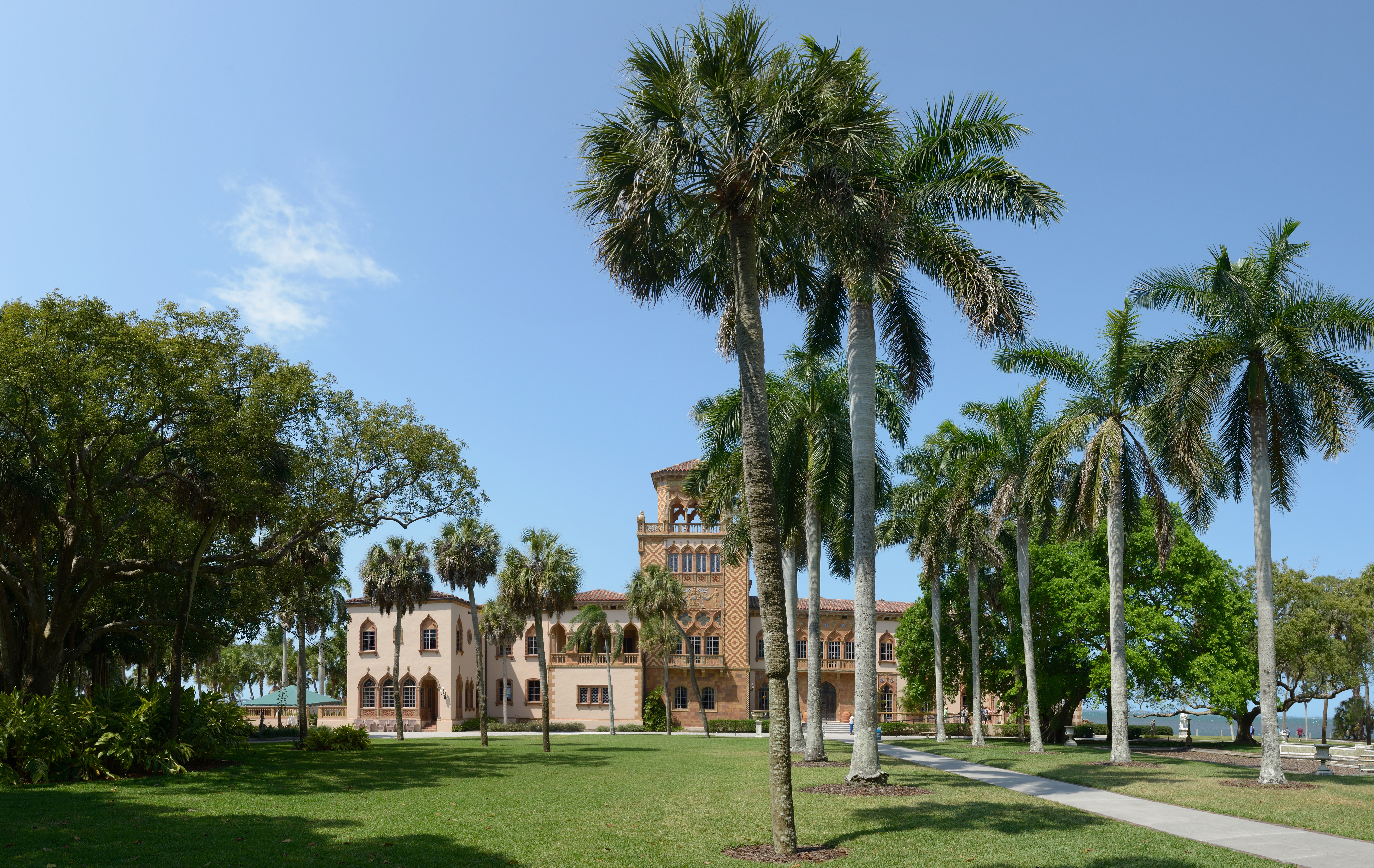 Take U.S. 41 North (Tamiami Trail), hugging the bay as it opens into a widening sheet of silver. Pass the Van Wezel, the purple seashell of a theater, and continue north. Just past the University Parkway intersection, a right turn at 5401 Bay Shore Road delivers you into another world: banyans, palms, and Mediterranean arches.