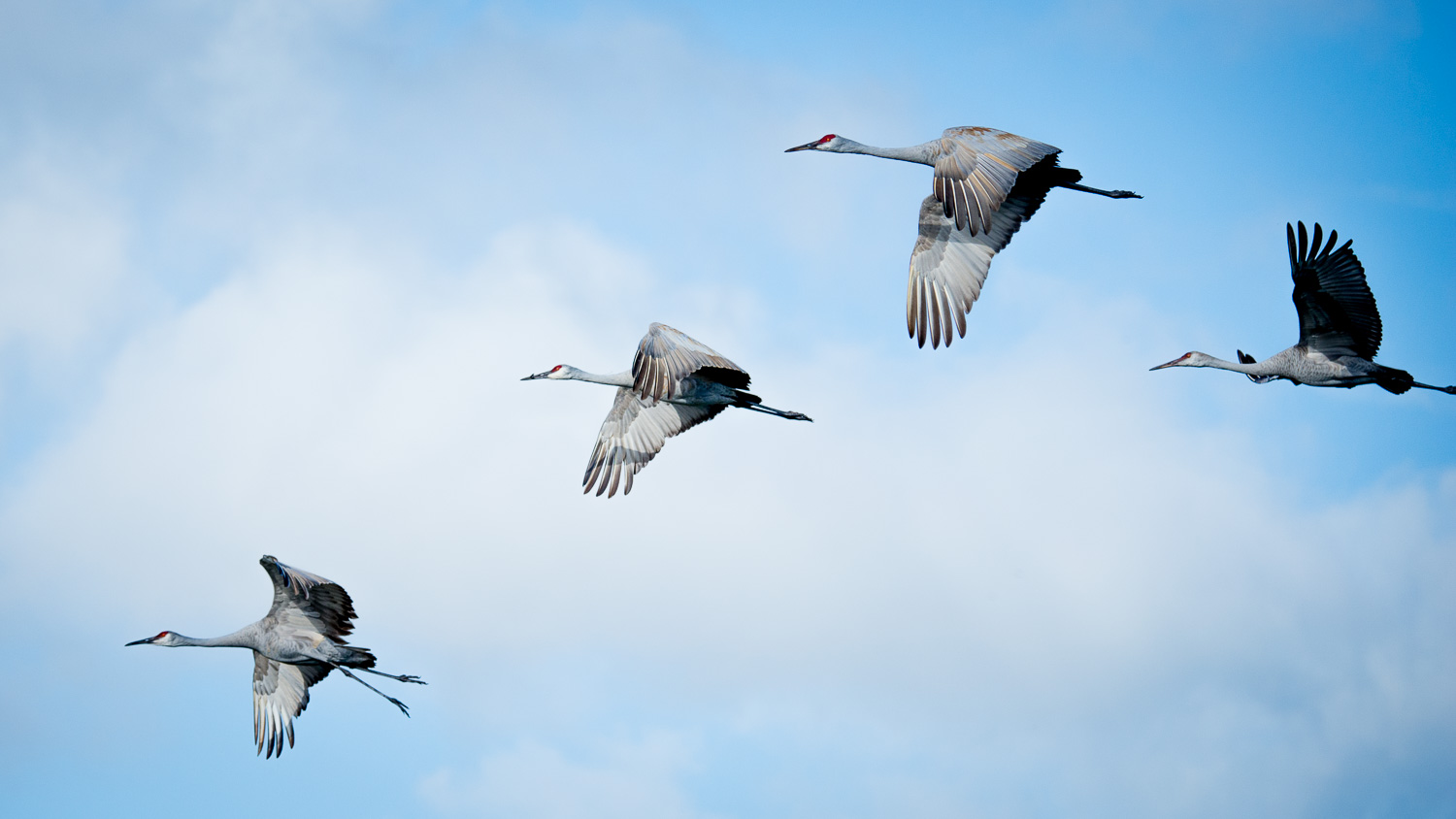 Sandhill cranes fly south for the winter. In their wintering areas, they form flocks over 10,000. One place this happens is at Bosque del Apache National Wildlife Refuge, 100 miles (160 km) south of Albuquerque, New Mexico. An annual Sandhill Crane Festival is held there in November.